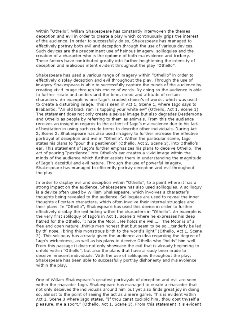 Deception in Shakespeare's Othello Deception, which by its definition is a bad thing and has only one level or…. Othello - Battle of Good vs, othello essays iago. Evil "I am not what I am. Othello's Impact on Today's Society In the late 's playwright, William Shakespeare's, Othello was successfully produced in the United States….
